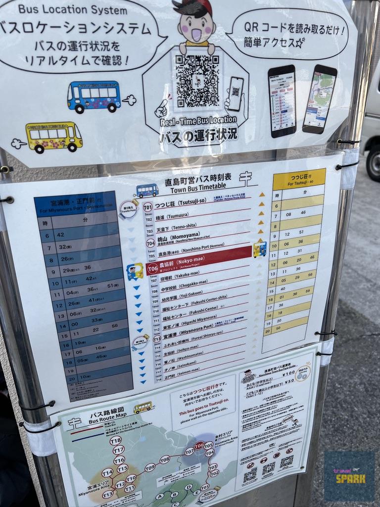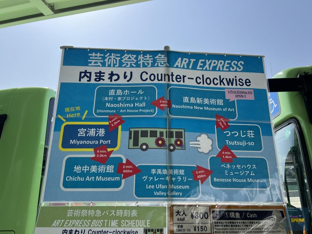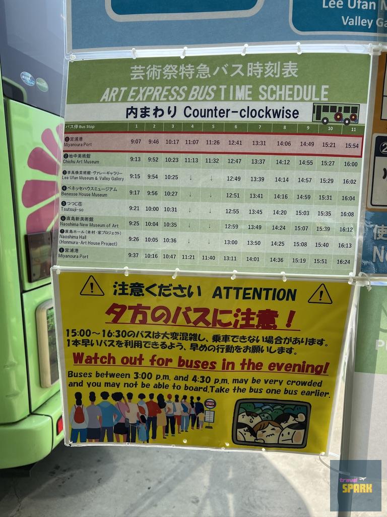 公車的部分我只有利用到直島、豐島、女木島,男木島徒步就可以走完大部分的藝術品。有些人會在島上租腳踏車或機車,但我自己全程是使用公車與走路代步,同樣官網有非常詳細的公車時刻表,如果連結壞了也不用擔心,下船時會有工作人員發紙本的公車時刻表。