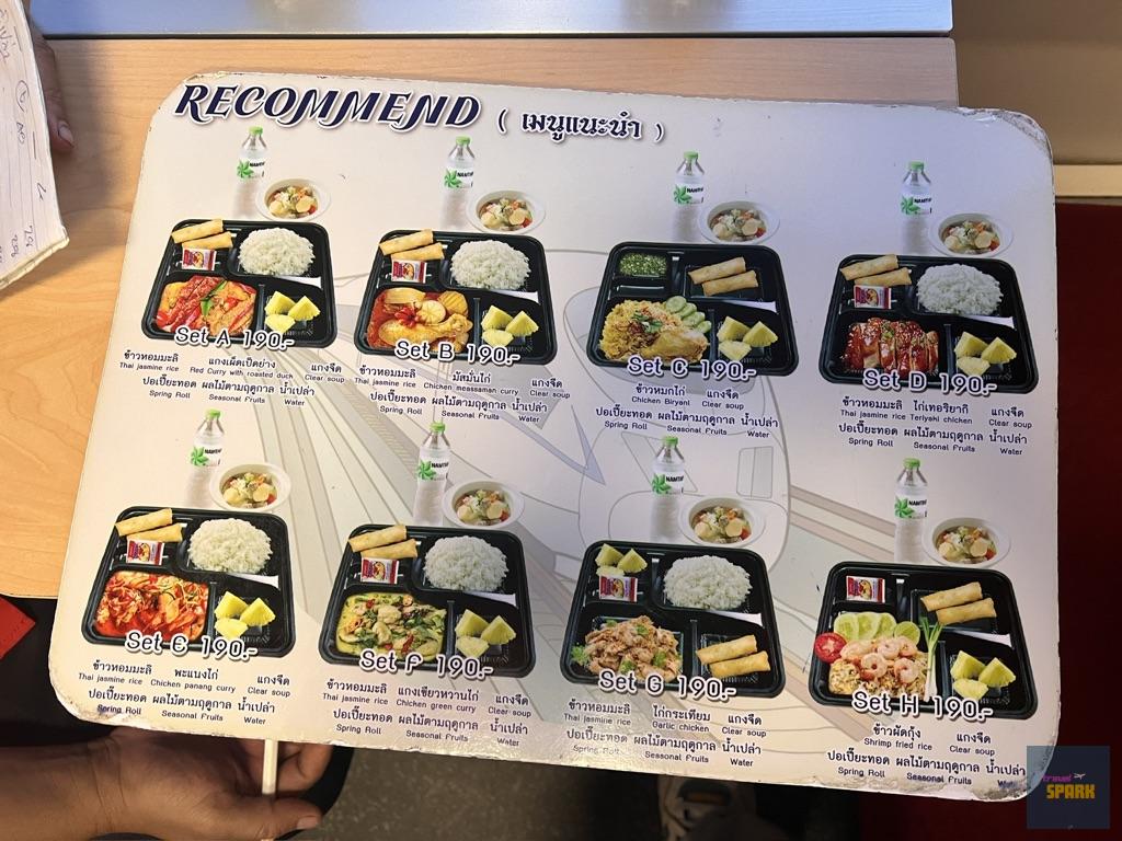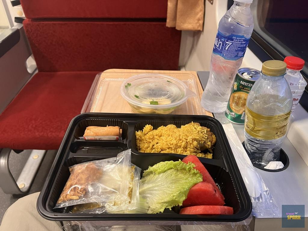 上車之後我看到有員工一直在送餐,好奇之下我就問了可不可以買晚餐,他就把板子給我看,均一價都是190泰銖。除了餐點外會再多一瓶水跟一碗湯(當下我真的是想說早知道上車不要買一瓶大水了,我只是在車上睡一晚是要喝幾瓶水XDDD)。