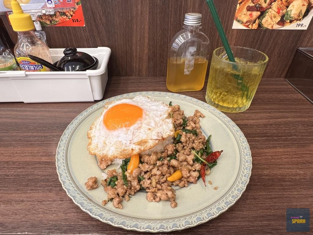 第一間是我第一天工作之後,我真的超 級 想 吃 打 拋 豬,就隨便Google了一間在Asoke附近的打拋豬店,我自己判斷一間店好不好吃,就是看他的蛋煎的好不好,畢竟連基礎功都做不好,我真的不相信東西會有多少吃捏。看到照片之後想都沒想就直接去吃那間店,果真真的超級好吃,也建議可以一起喝他的菊花茶,在炎熱的夏天整個身心舒暢,如果再去一次,我一定會吃這間店!