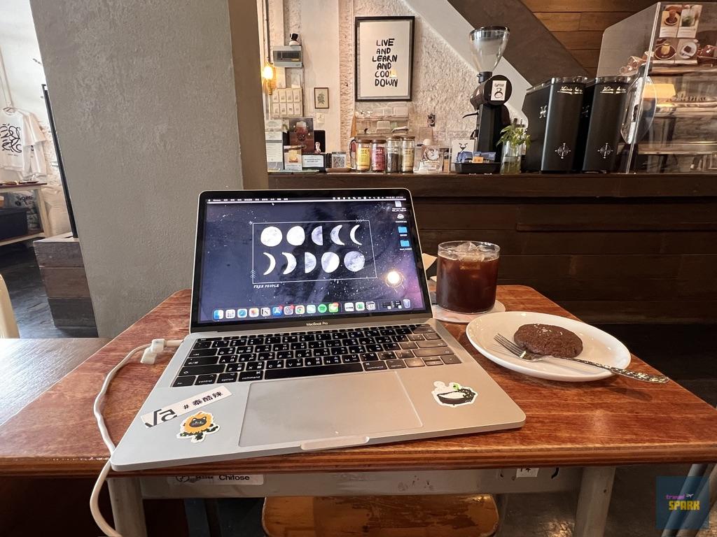 店其實蠻大的,但有點可惜的是插座不太多,我去的時候有詢問了一下店員,基本上有插座的地方都已經坐了人(當天只有大概五個人吧),不過店員跟我說最後一個位子是沙發,缺點就是椅子跟桌子是同高的,所以我工作必須彎腰,我說沒有關係,他就幫我把旁邊的檯燈插頭拔掉讓我使用。過一陣子問我這樣貓背工作會不會不太舒服,人蠻貼心的~