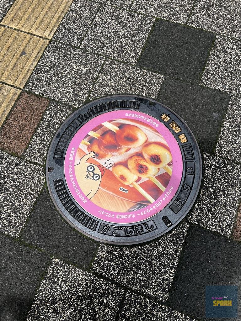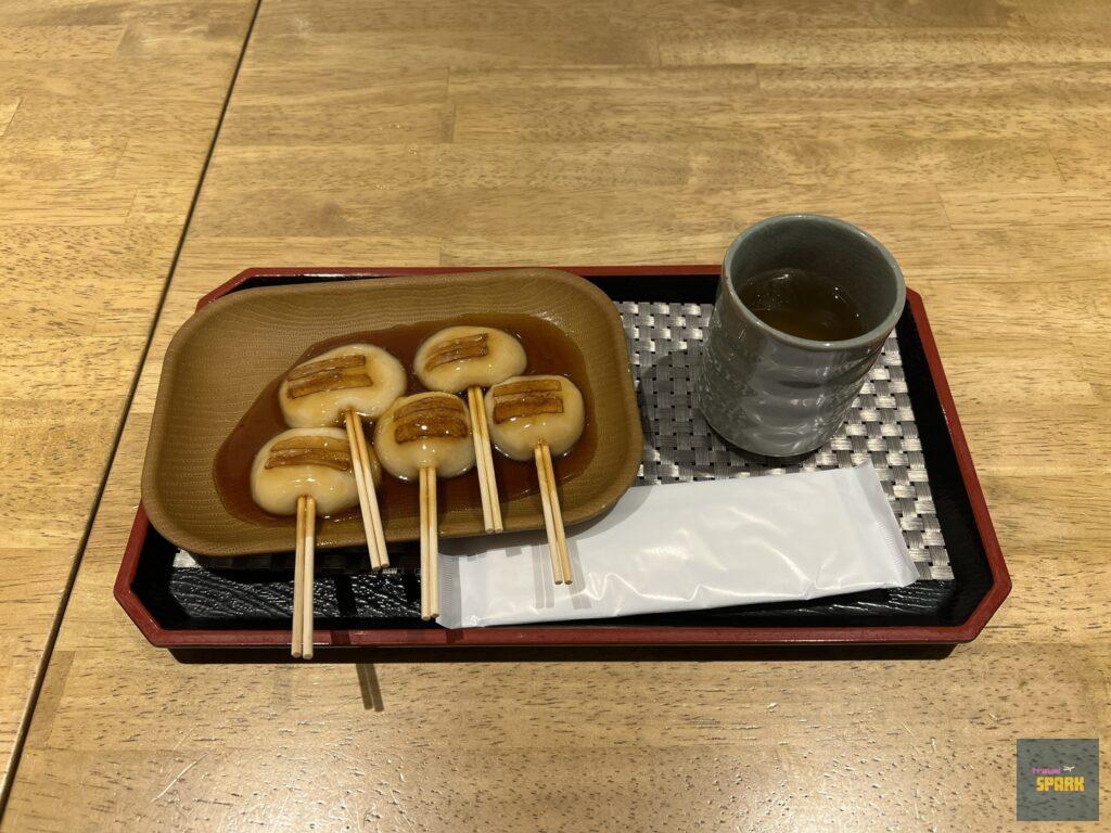 下面這個是鹿兒島名物「両棒餅(ぢゃんぼもち)」,我會點他主要是我在鹿兒島的街道走時,發現人孔蓋上有介紹到這個,所以就特別點來吃,但他其實就是兩根棒子上面插上烤麻糬,再淋上醬油的一個傳統小吃,會再額外附上一杯熱茶,沒有到一定要吃,但就想說是鹿兒島名物,就試試看XD。