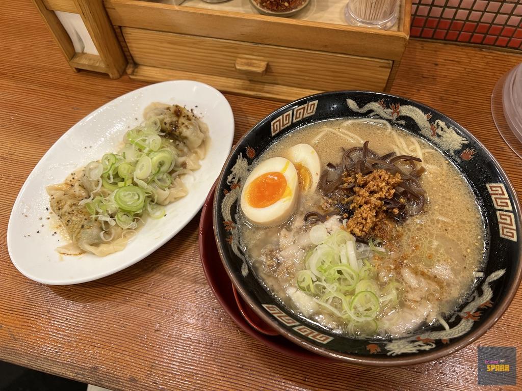 在日本真的就是滿滿的澱粉炸彈,這間是中午出門找看看要吃什麼的時候,看到有非常多人在外面圍觀的拉麵店,我就趁勢還沒有坐滿位子趕快衝進去XD。點餐方式是在排隊的時候用點餐機,後續會帶位入座。這次點的是他們招牌的「豚とろラーメン」,不過這個肉片(應該)不是黑豬,所以我又額外點了一個「黑豬肉餃子」,拉麵的湯頭很濃郁,日料裡面拉麵幾乎不是我的首選,但這碗拉麵我真的很喜歡,餃子的味道也很不錯!