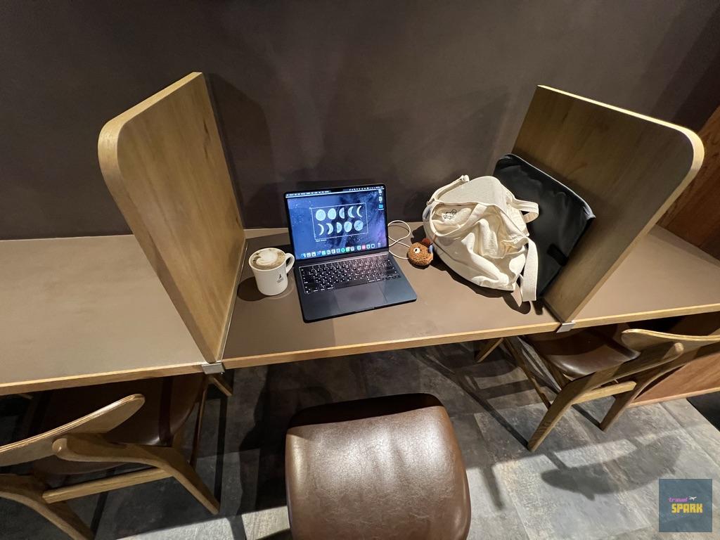 這間是我認真在鹿兒島非常喜歡的一間咖啡廳,主要是他離飯店很近,空間大、又有個人的工作桌,算是自由工作者很適合的一間咖啡廳!抱歉放了包包拍得有點亂XD,但我很喜歡有這個很像辦公桌的位子,而且還有兩個插座可以使用。